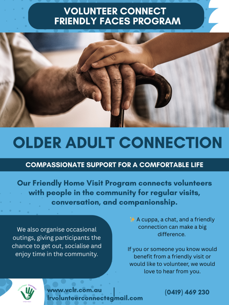 Our Friendly Home Visit Program connects volunteers with people in the community for regular visits, conversation, and companionship
